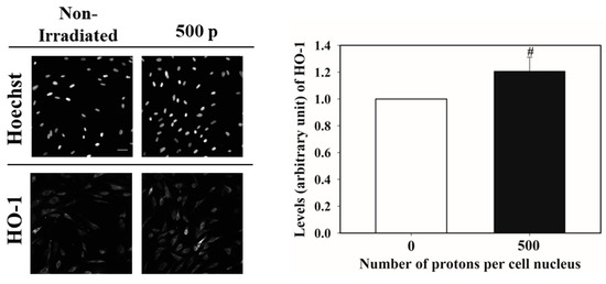 The 500 protons were irradiated at the nucleus of the WI-38 cells. Cellular HO-1 levels were detected by immunofluorescence staining 12 h later. Scale bar = 50 µm. # p value < 0.05.