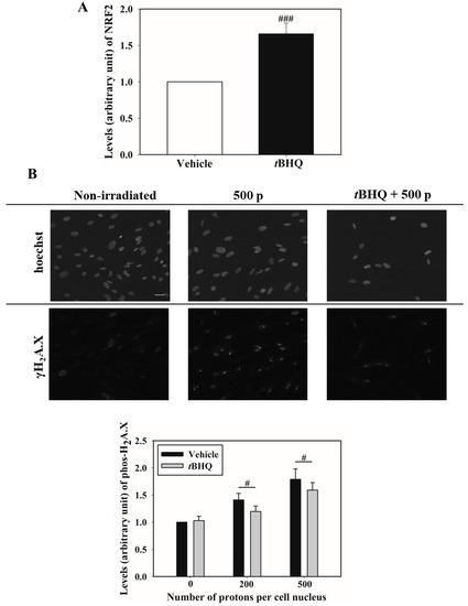 WI-38 cells were treated with 15 μmol/L of tBHQ or the vehicle for 16 h. Then, the nucleus accumulation of NRF2 was identified by immunofluorescence staining (A). WI-38 cells were treated with 15 μmol/L of tBHQ or the vehicle for 16 h. Then, the cell nucleus was targeted with 200 or 500 protons. Three hours later, the levels of γ-H2A.X were detected by immunofluorescence staining. Scale bar = 30 µm (B). # p value < 0.05. ### p value < 0.001.