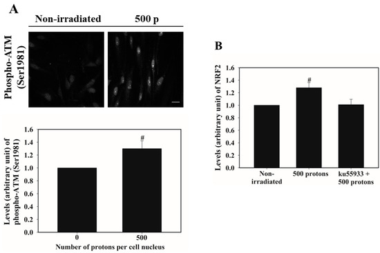 The nucleus of the WI-38 cells was targeted by 500 protons. One hour later, the levels of phosphorylated ATM (Ser1981) were detected by immunofluorescence staining. Scale bar = 30 µm (A). After being exposed to 10 µmol/L ku55933 for one hour, WI-38 cells were exposed to 500 proton nucleus irradiation. Then, the cells were incubated for 12 h in the medium containing 10 µmol/L ku55933 (B). The nucleus accumulation of NRF2 was detected by immunofluorescence staining. # p value < 0.05.