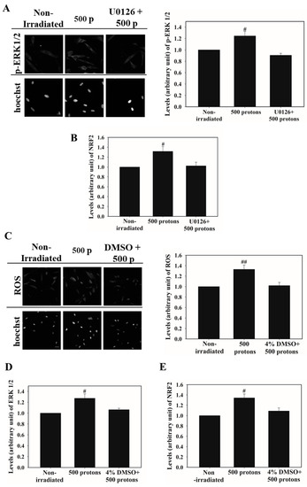 The WI-38 cells were treated or mock treated with 2.5 µmol/L U0126 for 30 min and then exposed to 500 proton nucleus irradiation. Immunofluorescence labeling was used to determine the levels of phosphorylated ERK 1/2 12 h later. Scale bar = 30 µm (A), and the WI-38 cells were treated with U0126 and nucleus targeted irradiation according to the conditions described in Figure 5A. Then, the nucleus accumulation of NRF2 was detected by immunofluorescence staining (B). Prior to and following 500 proton irradiation, the WI-38 cells were treated with 4% DMSO for 30 min, respectively. Then, the ROS levels were measured with hydroethidine, as described in the “Materials and Methods”. Scale bar = 50 µm (C). The WI-38 cells were treated with DMSO and nucleus irradiation using the same conditions in Figure 5C. Immunofluorescence labeling was used to determine the levels of phosphorylated ERK 1/2 (D) and nucleus accumulation of NRF2 (E) 12 h after irradiation. # p value < 0.05. ## p value < 0.01.