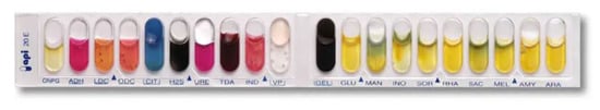 A total of 42 isolates (12.2%) were characterized regarding cell morphology and Gram stain. All strains were rod-shaped, Gram-negative, oxidase-negative, and catalase-positive. The biochemical profile of the isolates, obtained by API20E, is shown in Figure 1. Fish sellers’ hands (12 isolates, 23.5%), tilapia (16 isolates, 28.8%), and mugil (14 isolates, 36.9%) were the sources of the contaminated samples; patient stool was not a source. (Table 2).
