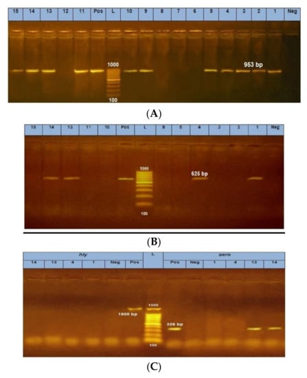(A) Representation of polymerase chain reaction (PCR) positives for 16S rRNA of the genus Aeromonas with an amplicon size of 953 bp. L: 100 bp ladder; lanes 1–5, 9–11, and 13–15: positive samples; lanes 6–8 and 12: negative samples; lane Pos: positive control. (B) Representation of polymerase chain reaction (PCR) positives for 16S rRNA of genus Aeromonas hydrophila with an amplicon size of 625 bp. L: 100 bp ladder; lanes 1, 4, 13, and 14: positive samples; lanes 2, 3, 5, 9, 10, 11, and 15: negative samples; lane pos: positive control; lane neg: negative control. (C) Representation of polymerase chain reaction (PCR) positives for 16S rRNA of aer and hly gene amplification of Aeromonas hydrophila isolates. L: 100 bp ladder; for the aer gene lanes (13 and 14): positive samples. Lane (1 and 4): negative sample. Lane Pos: positive control and lane Neg: negative control. For the hly the, lanes 1, 4, 13, and 14: negative samples. Lane Pos: positive control and lane Neg: negative control.