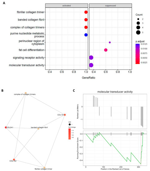 The GO term analysis revealed that the pathways, which are most significantly suppressed in DMDmut ECs, are mainly related to the perinuclear region of the cytoplasm, fat cell differentiation, signaling receptor activity, and molecular transduction (Figure 3A). To understand the complex relationship between the enriched pathways, we used the cnetplot function. This allows the visualization of the genes involved in the enriched pathways and genes belonging to annotation categories. Figure 3B shows the network of the most enriched upregulated genes (COL3A1, COL1A2, and COL1A1) involved in banded collagen fibrils, complex of collagen trimers, and fibrillary collagen trimers. To identify top pathway responsible for the observed phenotypes in DMDmut and control ECs, we performed the gene set enrichment analyses (GSEA). The top gene set enriched in the DMDmut ECs compared to control ECs was a classifier for inhibited molecular transducer activity (Figure 3C).