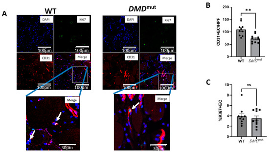The effect of DMD mutation on the density and proliferation of endothelial cells in DMDmut muscles compared to control muscles. (A) Immunofluorescent staining of CD31 and Ki67 was performed to detect EC density and cell proliferation in TA muscles from DMDmut and wide-type control mice. The regions of interest (white squares) were cropped from images (Upper). The CD31/Ki67-double positive cells were indicated with arrows. (B) The comparison of CD31-positive cells per high power field (HPF) between TA muscles from DMDmut and control mice (**, p < 0.01, n = 10). (C) The comparison of the percentage of Ki67-positive EC cells between TA muscles from DMDmut and wide-type control mice (ns, n = 10).