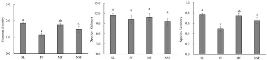 In terms of species composition, shrubland was dominated by Eupatorium adenophorum, Ternstroemia gymnanthera, and Vaccinium fragile. P. yunnanensis and Imperata cylindrica were the dominant species in PF. P. yunnanensis, Keteleeria evelyniana, and Cyclobalanopsis glaucoides were the dominant trees in MF. K. evelyniana, C. glaucoides, and Lithocarpus dealbatus were dominant in NSF. The average cover and the stand density of the dominant plants in the tree layer were the highest in NSF (Table 1). There were significant differences (p < 0.05) in the Shannon diversity index and species evenness among SL, MF, and NSF (Figure 1).