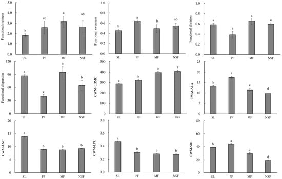 The functional diversity in the four communities presented different distribution patterns depending on its parameters (Figure 2). The highest FRic was found in MF and the lowest in SL. A significant difference was found only between SL and MF. The values of FEve in PF were significantly higher than those in MF and SL. For FDiv and FDis, the four communities showed similar patterns. FDiv and FDis in PF were significantly lower than those in the other three plant communities (Figure 2).