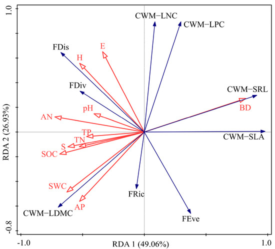Redundancy analysis (RDA) showed that the first two RDA axes explained a total of 75.98% of the variation in the different functional diversity indicators of the communities. Soil bulk density (BD) was correlated with CWM-SRL and CWM-SLA. A high correlation was also found between CWM-LDMC and SWC and AP (Figure 3). FDis and FDiv had close relationships to species diversity indicators (H, Shannon diversity, and E, species evenness). The results of correlation statistics showed that all the RDA axes of the functional attributes were closely linked to the species diversity and soil properties (SWC and AP) (Table 5).