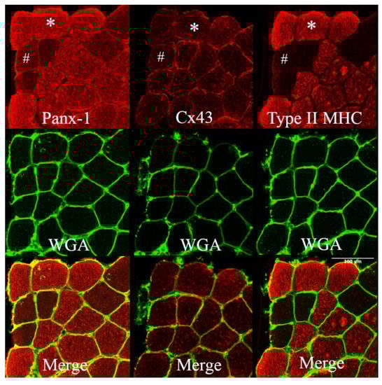 Panels showing Panx-1 and Cx43 immunostaining on human vastus lateralis biopsies at baseline. WGA lectin detects N-acetylglucosamine and N-acetylneuraminic acid (sialic acid) residues, resulting in the staining of the sarcolemma. Staining was obtained on serial cryosections. The staining of Panx-1 appears to significantly overlap with the Type II (IIA + IIX) MHC profile, and the intracellular staining is more prominent in fast muscle fibres. The same fast myofiber is indicated by an asterisk (*) showing Panx-1 intracellular staining. The hashtag (#) indicates the same Type I myofiber with poor Panx-1 intracellular but evident sarcolemma staining. Cx43 shows fainter staining, essentially at the membrane level without fibre-type specificity. Confocal microscope Leica SP5; 20×.