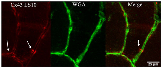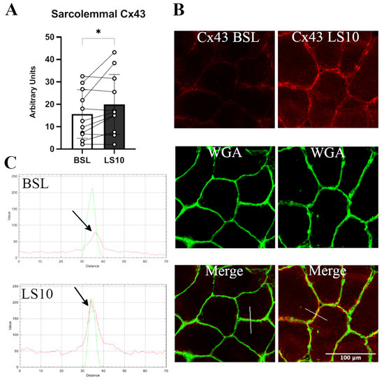 The transcriptomics data allowed us to quantify the normalised mRNA levels of Cx43 and Panx-1, which showed no significant alterations at LS10 (Figure S2). Thus, we further analysed the sarcolemmal protein level of both Cx43 and Panx-1 in immunostaining. For Panx-1, the quantification was fibre-type dependent. The immunostaining for Cx43 showed an increased positivity along the sarcolemma of VL muscle fibres after 10 days of ULLS. The staining was characterised as spotted along the membrane, indicating some preferred regions where Cx43 forms hemichannels, augmented by 28% at LS10 compared with the baseline (Figure 2A, p = 0.043). The merging colour confirmed the localization of the membrane signal with the WGA signal and by the plot profile detected along the sarcolemma, with a fluorescence signal peak on the sarcolemma (Figure 2B,C). The comparison of the BSL and LS10 staining obtained on the same slide and acquired with the same exposure, the same pinhole and the same smart gain showed an increase of Cx43 intracellular staining at LS10, as shown in Figure 2B, maybe suggesting an expression on the sarcoplasmic reticulum, as reported for Panx-1 in vitro [30].