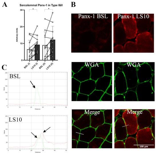 (A) Quantification of sarcolemma Panx-1 fluorescence in Type I and Type II (IIA + IIX) myofibers for baseline and after 10 days of ULLS. With (I) and (II) on the x-axis, the corresponding fibre type is indicated. Error bars represent standard deviations. Asterisks (*) indicate statistical significance at p < 0.05. (B) Typical staining images of Panx-1 for BSL and after 10 days of ULLS. In the middle, the WGA signal detected N-acetylglucosamine and N-acetylneuraminic acid (sialic acid) residues of the sarcolemma. Below are the merges between the two channels. (C) RGB profiles of the immunostaining of Panx-1. A line (width 5) has been drawn on the merge images (shown as a white line in the merge images), and RGB profiles were detected along the line. The peaks indicated by the arrows represent the green peak of the WGA signal referring to the sarcolemma fluorescence and the two red peaks (left and right) referring to the Panx-1 staining on the sarcolemma of Type I and Type II myofibers, respectively. A red peak is present only in the ULLS staining, proving its sarcolemmal upregulation. n = 11 male subjects; paired two-tailed t-test. Confocal microscope Leica SP5; 20×.