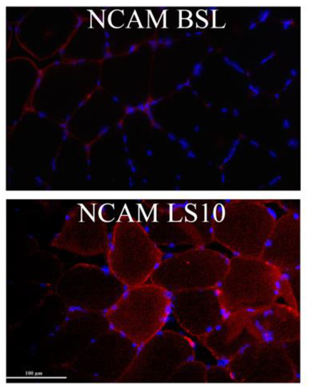 In the early stages of denervation occurring during the initial phase of disuse, NCAM is expressed and localised at the sarcolemmal level [4]. As reported by our group in Sarto et al., 2022 [6] and as shown in Figure 5, NCAM-positive muscle fibres augmented after disuse in most subjects.