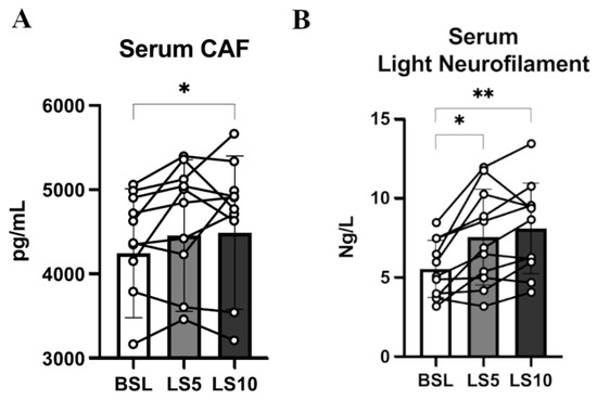 (A) Serum level of CAF at BSL, 5 days and 10 days after ULLS. (B) Serum level of light neurofilament at BSL, 5 days after ULLS and 10 days after ULLS. Error bars represent standard deviations. Asterisks (*) indicate statistical significance at p < 0.05. Two asterisks (**) is for significance at p < 0.01. Experiments were performed in duplicates. n = 11 male subjects; one-way ANOVA.