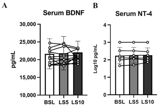 Serum neurotrophin levels were assessed at baseline, after 5 days of ULLS, and after 10 days of ULLS in (A) brain-derived neurotrophic factor and (B) Neurotrophin-4. Error bars represent standard deviations. All pairwise comparisons between time points were not statistically significant at p < 0.05. Experiments were performed in duplicates. n = 11 male subjects; one-way ANOVA.