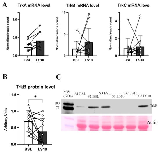 No significant changes at the transcriptional level in the TrkA, TrkB and TrkC mRNA levels were found, as reported by the transcriptomics data (Figure 8A). However, the protein level of their receptor, TrkB, was halved (−45%; p = 0.035) (Figure 8B,C and Figures S7–S9).