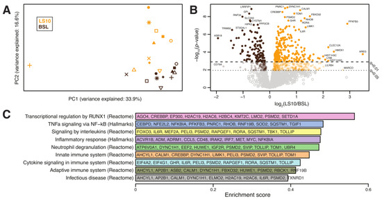 The RNA-Seq was performed at the Frederick National Laboratory for Cancer Research Sequencing Facility, NIH. The libraries were made using Illumina’s TruSeq Stranded Total RNA Library Prep protocol. This protocol involves the removal of ribosomal RNA (rRNA) using biotinylated, target-specific oligos combined with Ribo-Zero rRNA removal beads. The RNA was fragmented into pieces, and the cleaved RNA fragments were copied into first-strand cDNA using reverse transcriptase and random primers, followed by second-strand cDNA synthesis using DNA Polymerase I and RNase H. The resulting double-strand cDNA was used as the input to a standard Illumina library prep with end-repair, adapter ligation and PCR amplification performed to provide a library ready for sequencing. The samples were sequenced on the NovaSeq 6000 on an S4 flow cell using paired-end sequencing with a read length of 150 bps. The sequencing quality of the reads was assessed using FastQC (v. 0.11.5), Preseq (v. 2.0.3), Picard tools (v. 2.17.11), and RSeQC (v. 2.6.4) [15,16,17,18]. The samples had 295 to 419 million pass filter reads, with more than 90% of the bases being above the quality score of Q30. In addition, Kraken (v. 1.1) was used as a quality-control step to assess the microbial taxonomic composition [19]. The reads were trimmed using Cutadapt (v. 1.18) to remove the sequencing adapters prior to their mapping to the human reference genome hg38 using STAR (v. 2.7.0 f) in the two-pass mode [20,21]. The expression levels were quantified using RSEM (v. 1.3.0) with GENCODE annotation (v. 21) [22,23]. In order to filter out the low-expressed genes, the filterByExpr function from package edgeR (v. 3.32.1) was used, resulting in 20,555 genes passing through the filter [24]. Subsequently, quantile normalisation was performed using the voom algorithm from the Limma R package (v. 3.46.0), followed by empirical Bayes smoothing of the standard errors to assess the case-vs-control differentially expressed genes adjusted for subject ID (paired analysis) [25,26]. Gene set enrichment analysis was performed using the fgsea package (v. 1.20.0), and the reference gene set collections “Hallmarks” and “Canonical Pathways” (which includes the Reactome, KEGG, WikiPathways, PID and Biocarta gene sets) from the Molecular Signature Database, MSigDB (v. 7.4) [27,28]. A customised implementation in R was developed in-house to add robustness to the GSEA analysis; since GSEA’s enrichment estimates (and statistical significance) are stochastic, our software embeds GSEA in a Monte Carlo algorithm that performs 1000 iterations and chooses significant pathways based on the total statistical ensemble. We have only reported the pathways that appeared significant (based on the adjusted p-value < 0.05) in more than 80% of the iterations. We identified nine pathways associated with inflammation and denervation, which appeared significantly enriched in ULLS and were associated with these pathways, and identified a total of 2389 measured genes for downstream analysis (principal component analysis, differential gene expression, volcano plot).