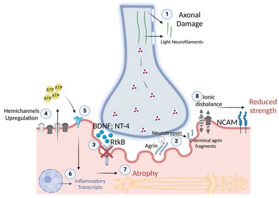 Overview of the potential physiological mechanisms during the early stages of disuse in humans. (1) After 5 days of disuse, the release of light neurofilaments suggests axonal damage, which may progressively cause NMJ instability (2) through the cleavage of agrin and the expression of NCAM, which show significance at 10 days of disuse. NMJ instability is associated with (3) reduced RtkB neurotrophin receptors for BDNF and NT-4, (4) which may be responsible for the marked sarcolemmal hemichannels’ upregulation after 10 days of disuse. In turn, hemichannels may start to release ATP with paracrine properties, (5) acting on purinergic receptors, (6) resulting in the transcription of inflammatory transcripts and (7) in muscle atrophy, with the progression of disuse. Indeed, (8) sarcolemmal hemichannels upregulation may cause ionic disbalance along the sarcolemma, resulting in unstable membrane potential at rest and a reduced capacity to generate efficacious excitation-contraction coupling cascades, resulting in reduced muscle strength.
