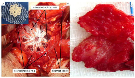 - Amato, G.; Agrusa, A.; Di Buono, G.; Calò, P.; Cassata, G.; Cicero, L.; Romano, G. Inguinal Hernia: Defect Obliteration with the 3D Dynamic Regenerative Scaffold ProflorTM. Surg. Technol. Int. 2021, 38, 199–205. [Google Scholar] [CrossRef]