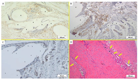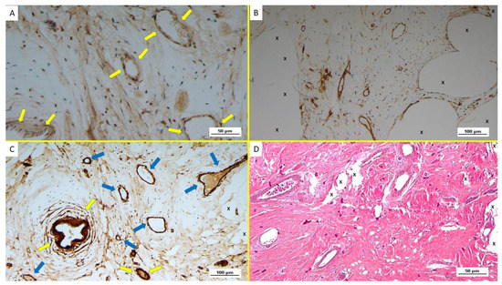 After incubation, the slides were washed out three times for five minutes with phosphate-buffered saline (PBS), then treated at room temperature for 30 min with biotinylated immunoglobulin (LSAB, Dako Agilent, Santa Clara, CA USA). After twice cleansing with PBS for 5 min, the slides were incubated at room temperature for 60 min with streptavidin, horseradish peroxidase conjugate. After washing out 3 times with Tris-buffer saline (TBS), the slides were incubated with chromogen 3-3′-diaminobenzidine tetrahydrochloride (DAB; Dako Agilent, Santa Clara, CA, USA). Sections were then cleansed in running water and counterstained with Mayer’s hematoxylin, following dilution for 1 min in 0.035% TBS. In the case of positivity, the DAB-reaction established a brown precipitate. Specific primary antibodies were replaced in tissue sections with normal goat serum or PBS and were used as negative controls. Tissue specimens with specific tissue markers (vascular, nervous, or muscle tissue) were used as a positive control. All immune-stained slides were examined at a 100× magnification by means of Leica DMR microscope equipped with a Nikon DS-Fi1 digital camera and image capture software (NIS Basic Research Nikon software).
