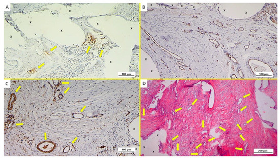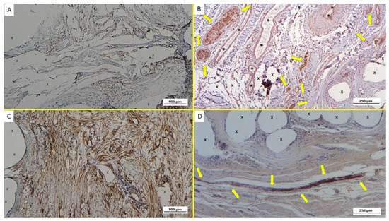 Immunohistochemistry of biopsy specimen excised from ProFlor 4 months post-implantation (mid-term—MT). (A): VEGF-stained vascular elements (yellow arrows) in the stage of development close to the polypropylene fabric of the 3D hernia device (X). VEGF 100X. (B): Biopsy specimen excised from ProFlor 3 months post-implantation (mid-term—MT): many vasculo-endothelial structures (stained in brown) in the advanced stage of development throughout the polypropylene fibers of the 3D scaffold (X). CD31 100X. (C): Biopsy specimen excised from ProFlor 4 months post-implantation (mid-term—MT): increased evidence of SMA-induced smooth musculature development in arteries and veins was detectable. SMA 100X (D): Biopsy sample removed from ProFlor 5 months post-implantation (mid-term—MT): several vascular structures in the advanced stage of development (yellow arrows) close to the polypropylene fabric of the 3D scaffold (X). No inflammatory reaction detectable. EE 50X.