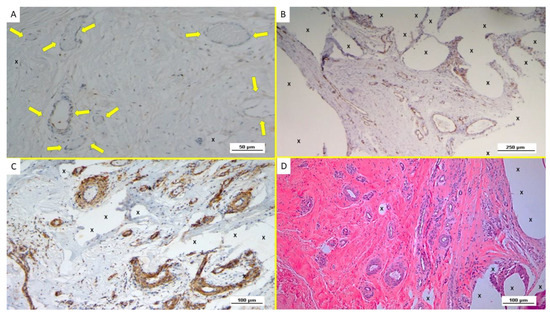 Biopsy specimen excised from ProFlor 28 months post-implantation (extra-long-term—ELT). (A): limited amount of well-structured VEGF positive venous elements in the stage of advanced development (yellow arrows). VEGF 200X. (B): Biopsy specimen excised from ProFlor 24 months post-implantation (extra-long-term—ELT): several mature vascular elements showing well-structured endothelium (stained in brown) highlighted throughout the polypropylene structure of ProFlor (X). CD31 100X. (C): Biopsy specimen excised from ProFlor two years post-implantation (extra-long-term—ELT): several SMA-positive muscle layers of arteries (yellow arrows) and veins (blue arrows) close to the polypropylene fabric of ProFlor (X). SMA 100X—(D): Biopsy sample removed from ProFlor three years post-implantation (extra-long-term—ELT): several mature vascular structures close to the polypropylene fabric of the 3D scaffold (X). No inflammatory reaction detectable. EE 200X.