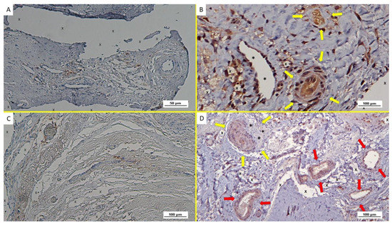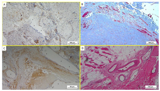 Biopsy specimen excised from ProFlor 6 weeks post-implantation (short-term—ST). (A): Several VEGF-positive angiogenetic clusters composed of vascular elements in the stage of development (brown spots) close to the polypropylene fabric of the 3D scaffold (X). VEGF 100X—(B): Immunohistochemistry in biopsy sample excised from ProFlor 4 weeks post-implantation (short-term—ST). Many clusters of vasculo-endothelial elements in the early stage of development (stained in brown) throughout the polypropylene fabric of ProFlor. CD31 100X—(C): biopsy sample excised from the 3D scaffold 5 weeks post-implantation (short-term—ST). Rare actin-positive vascular structures (stained in brown) close to the fabric of the 3D hernia device (X). SMA 200X—(D): Biopsy specimen excised from ProFlor 5 weeks post-implantation (short-term—ST). Several angiogenetic clusters composed of vascular elements in the stage of development close to the polypropylene fabric of the 3D scaffold (X) with negligible inflammatory response. An elongated nervous structure in development is also detectable (*). EE 100X.