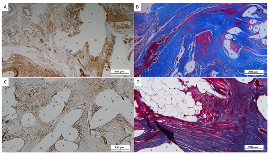 (A): Biopsy specimen excised from ProFlor 8 months post-operation (long-term—LT): several NGF-positive cells close to the polypropylene fibers (X). The white/brown targeted spots on the left upper section of the image indicate the presence of many vascular elements. NGF 50X—(B): Biopsy sample excised from ProFlor 7 months post implantation (long-term—LT)—(A): large areas of mature muscle bundles (stained in red) within the polypropylene fibers (X) of the 3D scaffold distributed in a context of well-perfused connective tissue (stained in blue). On the left upper margin, several vascular structures are clearly detectable. AM 50X—(C): Biopsy specimen excised from ProFlor 36 months post-operation (extra-long-term—ELT): evidence of several NGF-positive cells colored in brown and surrounding the polypropylene structure of ProFlor (X). NGF 50X—(D): Biopsy specimen excised from the ProFlor 24 months post implantation (extra-long-term—ELT). Abundant mature muscle bundles stained in red close to a cluster of adipose tissue (white spots) surrounded by a large number of connective fibers close to the polypropylene fabric of the 3D scaffold (X). AM 50X.
