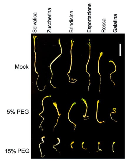 Cichorium intybus L. seeds of the Selvatica, Esportazione, Rossa Italiana and Galatina varieties were provided by the Larosa Emanuele Sementi company (Trani, Italy); Zuccherina di Trieste variety was provided by the Ferritalia company (Padova, Italy), and Brindisina variety was provided by the Franchi Sementi company (Grassobio Bergamo, Italy). Chicory seeds were soaked for 2–3 h in running tap water, surface-sterilized with 0.6% (v/v) commercial bleach solution for 10 min, then germinated and grown, at 22 °C for 6 days in the dark, on Petri dishes (Ø = 9 cm) containing two layers of Whatman No. 1 filter paper (Whatman Ltd., Maidstone, UK) embedded with either 5 mL of distilled water, or 5% or 15% PEG-6000 solution [28]. High-molecular-weight PEG reduces water potential primarily by matric forces, rather than osmotic forces, and it is not able to penetrate the pores of plant cell walls, thus causing cytorrhysis (withdrawal of water from and shrinkage of both the cell wall and protoplast), rather than plasmolysis, where only the protoplast loses water and may separate from the cell wall. For these reasons, treatment with high-molecular-weight PEG is more similar to soil-drying than the osmotic stress imposed by low-molecular-weight solutes [45]. Further, PEG-6000, a non-penetrating osmotic agent, lowers water potential, causing a water stress condition corresponding to 0 (mock), −0.1 MPa ψW (5%) fir moderate drought stress, and −0.4 MPa ψW (15%) for severe drought stress [46]. Each experiment was repeated 5 times, sowing ten seeds per plate, with a total of 50 seeds for each variety and treatment. After 6 days, the germination index (GI) was calculated as the percentage of germinated, healthy seedling among the total number of tested seeds; the 6 day-old seedling root length and aerial part (epicotyl and first leaflets) height were measured with a ruler under a stereomicroscope (Stemi 508, Zeiss, Oberkochen, Germany).