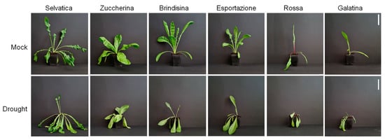 Phenotype of the analyzed chicory varieties. Six week-old chicory plants were grown, for a further 10 days, in hydrated soil (Mock) or without watering (Drought). Scale bar = 10 cm.
