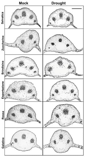 The detailed cellular phenotypes of the different plants were analyzed by comparing thin transverse sections carried out at the central vein level of each chicory leaf, all showing a typical dorsoventral organization (Figure 3). Almost all varieties showed more expanded parenchyma cells in the median position of the single central vein (midvein); only the Brindisina and Galatina varieties showed lysigenous cavities in the corresponding area. Beyond this specific characteristic, no other significant morphological variations were observed in the parenchyma tissue, in which the bundles of different size were immersed. The bundles at the level of the central vein were mostly well differentiated in all varieties, and have a developed cap of sclerenchyma fibers at both the phloem and xylem levels. The number of the vascular bundles in the midvein was different in the different varieties, and was higher in the more developed ones. The leaves of Selvatica, Brindisina and Esportazione varieties had five bundles, with dimensions that progressively decreased from the center to the periphery of the midvein. The Zuccherina di Trieste variety showed three larger bundles and, laterally, two small very reduced bundles; the central rib of the Rossa Italiana and Galatina plants was characterized by only three bundles. The leaf lamina of all the varieties showed bundles of reduced dimensions, and was made up of few elements that were not fully differentiated (Figure S3). After a period of water stress, no variations in the number of bundles were evident. Furthermore, the expanded parenchyma cells gave rise to large lysigenous cavities in all the stressed varieties, with the exception of the Rossa Italiana, which still showed highly expanded cells. In the Brindisina variety, the lysigenous lacunae, well visible in the controls, become a single large cavity (Figure 3).