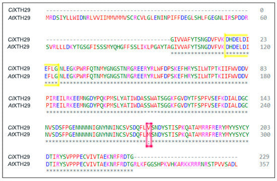 Comparison of CiXTH29 partial amino acid sequence and the AtXTH29 amino acid sequence. The yellow box indicates the catalytic site of the XTH family. The red box indicates a substitution in the CiXTH29 amino acid sequence with respect to the AtXTH29 one. “*” indicates identical amino acid residues, “:” indicates a conservative amino acid replacement.