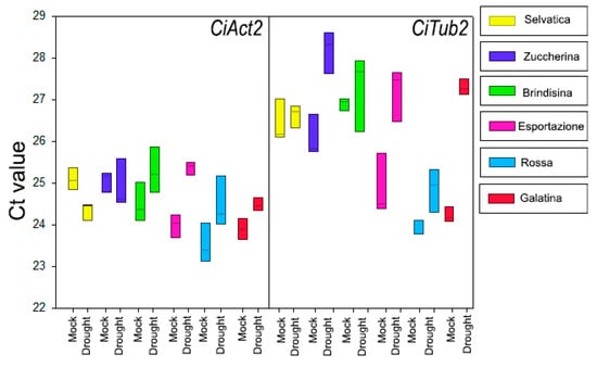 To identify stable reference genes in chicory varieties, we tested the possibility of using chicory β-tubulin2 (CiTub2) and actin2 (CiAct2) as reference genes in real time- quantitative PCR (RT-qPCR) analyses. The analyses were performed with primers previously [48] used in C. intybus for the amplification of actin2 and β-tubulin2 (Table S1). All primer couples were tested on mRNA samples isolated from the basal rosette leaves of 6 week-old chicory varieties, grown for a further 10 days with (mock) or without watering (drought stress condition); the mean and standard deviation of the Cycle threshold (Ct) values for each putative reference gene were analyzed and compared (Figure 5, Table S2). The results of the two reference genes’ amplification displayed a range of transcription levels across all analyzed samples, with average Ct values ranging from 23 to 28 (Figure 5, Table S2). Since gene expression levels are negatively correlated with Ct values, the amplification product obtained with CiAct2 primer pairs exhibited the highest abundance, with the lowest mean Ct value of 23.51 ± 0.47 observed in Rossa Italiana plants under the mock condition, while the highest mean Ct value was 25.36 ± 0.15, observed in the drought-stressed Esportazione variety.