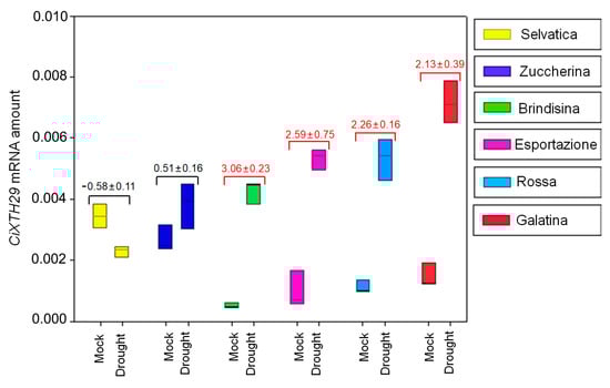 Expression pattern of the CiXTH29 gene in basal rosette leaves of 6 week-old chicory plants kept for a further 10 days with (Mock) or without watering (Drought). Amplification output values of CiXTH29 mRNAs are expressed as 2−∆Cq, and are considered as being proportional to the amount of mRNA, according to [55]. The differential expression of CiXTH29 in stressed conditions is reported as mean ± standard deviation of log2FC, with respect to the control, for each variety. The red values indicate CiXTH29’s upregulation, the black values indicate no variation in the expression levels. The experiments were performed in three independent biological replicates. The results are presented with box plots (middle bar, median; box limits, upper and lower quartiles; whiskers, min. and max. values).