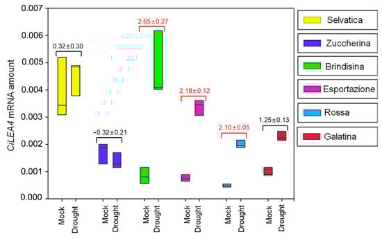 Expression pattern of CiLEA4 gene in basal rosette leaves of 6 week-old chicory plants kept for a further 10 days with (Mock) or without watering (Drought). Amplification output values of CiLEA4 mRNAs are expressed as 2−∆Cq, and are considered as being proportional to the amount of mRNA, according to [55]. The differential expression of CiLEA4 in stressed conditions is reported as the mean ± standard deviation of log2FC, with respect to the control, for each variety. The red values indicate CiLEA4’s upregulation, the black values indicate no variation in the expression levels. The experiments were performed in three independent biological replicates. The results are presented with box plots (middle bar, median; box limits, upper and lower quartiles; whiskers, min. and max. values).
