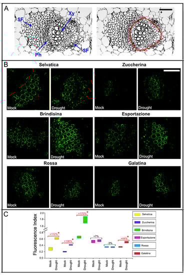 Monoclonal antibodies have shown to be highly sensitive molecular tools for the detection of cell wall polysaccharides. We used the LM24 xyloglucan monoclonal antibody [56] to detect the presence of xyloglucans in the cell walls of the histological elements of the largest bundle present in the leaf midvein of chicory varieties grown in water (Mock) and without watering (Drought). Thin sections obtained at the level of the central vein were immunolabeled with LM24, and the fluorescence index was measured as the ratio between the antibody fluorescence and the autofluorescence of the analyzed tissues. In all chicory varieties, the xyloglucans probed by LM24 were detected in the cell wall of xylem vessels (Figure 8). The highest detection of xyloglucans was found in the Brindisina variety grown under control conditions or subjected to ten days of water deficit; under this condition, an increase in xyloglucan in the xylem vessels equal to 170% was observed. The xyloglucan content values in the Selvatica and Zuccherina di Trieste varieties were lower than in the Brindisina one, both in mock and drought conditions, and sharply increased, respectively, to 112% and 106% during water stress. The Esportazione and Rossa Italiana varieties did not show significant changes in xyloglucan content after 10 days of water deficit, while in the Galatina bundle leaves, the detection of xyloglucans increased by approximately 44% after drought stress.