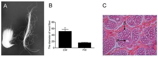 Comparison of coarse and fine wool and hair follicle traits of Wan strain Angora rabbits. (A) The appearance of coarse and fine wool. (B) The diameter of coarse and fine wool. ** p < 0.01. (C) Histological analysis of hair follicles. P means primary hair follicle; S means secondary hair follicle.