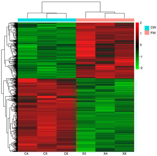Heatmap analysis of the DEGs in hair follicles between coarse and fine wool from rabbits. Increased expression is marked in red, and decreased expression is marked in green; C represents coarse wool group; X represents fine wool group.