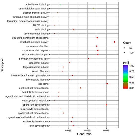 GO functional enrichment analysis showed that a large number of DEGs were involved in regulating skin development, epidermis development, epidermal cell differentiation, regulation of epithelial cell proliferation, keratinocyte differentiation, and epithelium development. The results indicated that DEGs are potential regulators of hair structure and diameter in rabbits. KEGG enrichment analysis is often used for gene function study. Interactions between the Wnt, Notch, Hedgehog, and BMP signaling pathways are involved in regulating normal hair follicle development [48]. In the present study, the Notch and ribosome pathways were substantially enriched with DEGs. Notch signaling is known to regulate cell fate, proliferation, differentiation, and pattern formation during the postnatal development of hair follicles [49,50]. Notch signaling is also necessary for complete maturation of hair follicles and postnatal hair cycle homeostasis [1,51,52]. It has been reported that DEGs between black and white hair follicles in giant pandas are also enriched in the ribosomal pathway [53]. Our results demonstrated that the Notch and ribosome pathways were key pathways of fiber structure. The GO functional enrichment and pathway analysis of DEGs in the current study elucidate the mechanisms of hair follicle development and the difference in fiber structure between coarse and fine wool in rabbits.