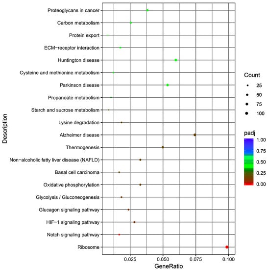 GO and KEGG were used to identify the potential functions of the DEGs. The GO terms and KEGG pathways with padj ≤ 0.05 were considered to be significantly enriched. In addition, 1545 and 1095 DEGs were involved in 3748 biological processes based on GO terms and 316 KEGG pathways, respectively. For GO term analysis, a comparison between hair follicles of coarse and fine wool showed that some biological processes, including skin development (50 DEGs), epidermis development (47 DEGs), regulation of epithelial cell proliferation (48 DEGs), epidermal cell differentiation (30 DEGs), keratinocyte differentiation (23 DEGs), epithelium development (118 DEGs), and developmental induction (11 DEGs) (Figure 3, Supplementary File Table S3), were substantially enriched. In addition, the Notch and ribosome signaling pathways were substantially enriched by DEGs between the hair follicles of coarse and fine wool (Figure 4). This suggests that DEGs in these GO categories and KEGG pathways may play key roles in regulating wool traits.