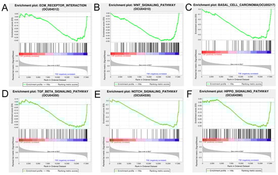 Gene set enrichment analysis was used to analyze the substantially enriched signaling. The enrichment scores of genes in the pathways were calculated using the GSEA algorithm. NOM p-value < 0.05 and |NES| > 1 were considered significant enrichment. (A) Extracellular matrix receptor interaction. (B) Wnt signaling. (C) Basal cell carcinoma. (D) TGF-β signaling. (E) Notch signaling. (F) Hippo signaling.