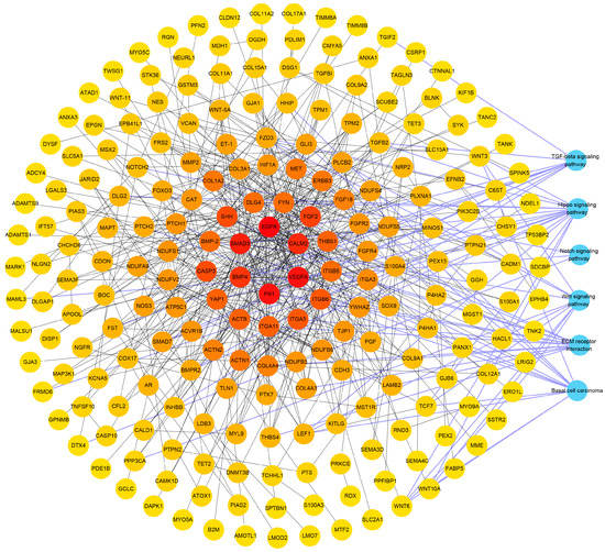 PPI analysis for DEGs in hair follicles between the coarse and fine wool groups. Each node means a gene, and each edge means the interaction between genes. The blue nodes mean the signaling pathways enriched by DEGs. A darker color indicates a stronger interaction with more genes.