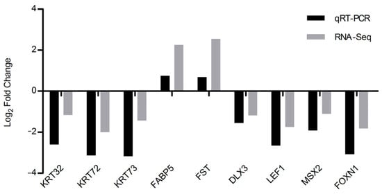 To evaluate our RNA-Seq results, KRT32, KRT72, KRT73, FABP5, FST, DLX3, LEF1, MSX2, and FOXN1 were selected and their expression patterns in the hair follicles of coarse and fine wool of Angora rabbits were examined using qRT-PCR (Figure 7). FABP5 and FST were upregulated in the hair follicles of the coarse wool groups; KRT32, KRT72, KRT73, DLX3, LEF1, MSX2, and FOXN1 were upregulated in the hair follicles of the fine wool groups. The results showed that the trends in expression of these genes were similar to those of the RNA-Seq, demonstrating our analysis was reliable.