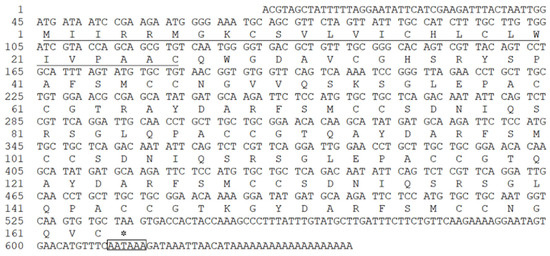 The cDNA and deduced amino acid sequence of cysrichin. Note: the underlined sequence represents a putative signal peptide; the boxed sequence is a putative polyadenylation signal (AATAAA); the cDNA sequence has been deposited in GenBank (Accession No.: MN829946).