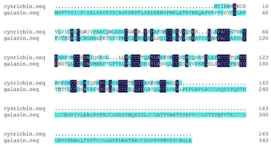 Alignment of amino acid sequences of cysrichin and galaxin. Note: the number on the right represents the position of the last amino acid.