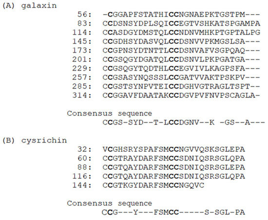 The tandem repeat structure in galaxin and cysrichin. Note: The information about galaxin was obtained from the study of Fukuda et al. [14], GenBank Accession No. AB086183. The galaxin protein was isolated from coral Galaxea fascicularis. Numbers on the left indicate the position in the predicted protein, and “−” represents an arbitrary amino acid. The consensus sequence for the repeats from each protein is shown beneath the alignments.