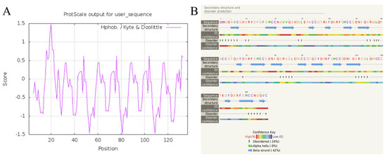Hydrophobicity analysis (A) and secondary structure prediction (B) of cysrichin. Note: hydrophobicity analysis was performed by ProtScale, and secondary structure was predicted with Phyre2.
