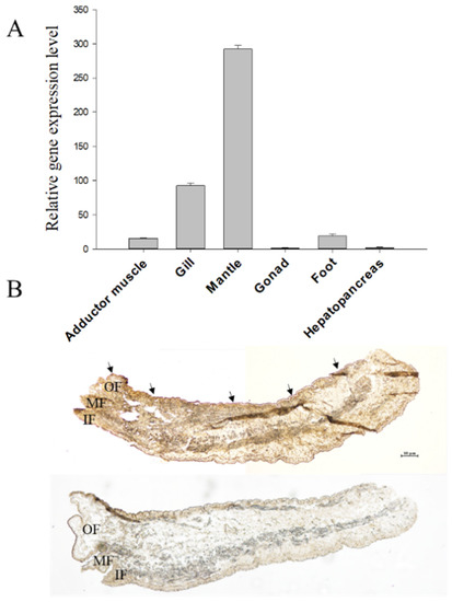 Tissue expression analysis (A) and ISH (B) results. Note: (B), purple hybridization signals were detected in the outer fold epithelial cells of the mantle in the experimental group. OF: outer fold, MF: middle fold, IF: inner fold.