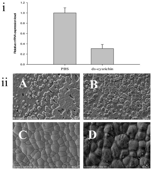 Influence of cysrichin on the morphology of newly formed crystals on the shell. (i) The relative expression level of cysrichin after RNAi; (ii) Crystal morphology of the shell surface after RNAi. Note: (A,B) The nacreous layer; (C,D) The prismatic layer; (A,C) The PBS group; (B,D) The ds-cysrichin group.