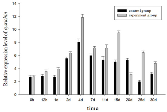 Figure 7 shows the cysrichin expression pattern after shell notching. Both the experimental and control groups showed a similar expression trend. Thus, the change in the expression trend might be related to the physiological status of mussels. The cysrichin gene expression level was significantly increased to its maximum value on day 2, and a high expression level was maintained from day 2 to day 30. The experimental group showed a higher cysrichin expression level than the control group, except on day 20.