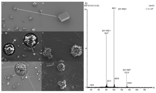 Crystal morphology detection by SEM and MS analysis of the cysrichin polypeptide. Note: (A) Control group, (B) Magnified view of the crystal indicated by the arrow; (C–F) Effects of cysrichin on crystallization; the circled areas are the magnified view of the arrow. (C,E,F) When a total of 90 µg/mL cysrichin was added to the system; (D) when 60 µg/mL cysrichin was added to the system. (G) Mass spectrogram of the synthetic cysrichin peptide.
