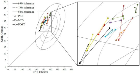 Z was calculated as √(R2 + Xc2), and PhA as tan−1 (Xc/R · 180°/π). R, Xc and Z were adjusted by height (R/H, Xc/H, Z/H). TBW, ICW and ECW were estimated by the athlete-specific prediction models proposed by Matias et al. [] on the basis of height, BM, R, Xc and sex. RXc Z-score graph was used to plot the cyclists on the three checkpoints (PRE, MID, POST) regarding the 50%, 75%, and 95% tolerance ellipses for the general Italian healthy adult male population []. In accordance with the classic BIVA, the reference population selected may be divided into 4 quadrants: upper left quadrant representing athletes, lower left quadrant representing obese individuals, upper right quadrant representing lean individuals, and lower right quadrant representing cachectic individuals. Furthermore, RXc paired graphs were used to compare bioelectrical differences over time and inter-limb symmetry. In these graphs, ellipses overlapping the origin indicate no differences, whereas non-centered ellipses indicate significant changes.